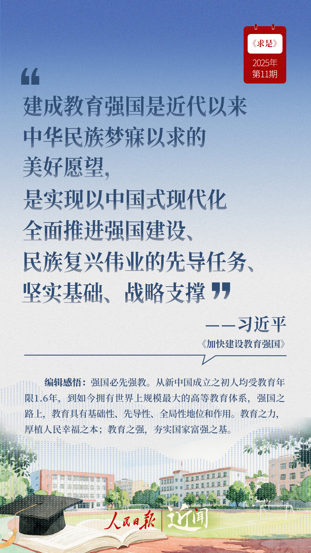 教育是國之大計、黨之大計。日前,《求是》雜志發(fā)表習(xí)近平總書記重要文章《加快建設(shè)教育強國》?!叭姘盐战逃恼螌傩浴⑷嗣駥傩?、戰(zhàn)略屬性”“讓教育改革發(fā)展成果更多更公平惠及全體人民”“讓教師享有崇高社會聲望、成為最受社會尊重的職業(yè)之一”……通過這些話,一起感悟習(xí)近平總書記對教育強國建設(shè)的謀劃與部署。