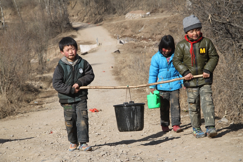 元古堆村的孩子們從取水點(diǎn)抬水。攝于2013年3月。新華社記者 范培珅 攝