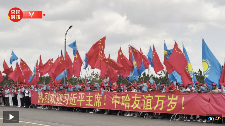 當地時間6月16日中午,習近平主席乘車從機場赴下榻飯店途中,中資企業和留學生代表聚集在道路兩旁,手持“熱烈歡迎習近平主席!”“中哈友誼萬歲!”等紅色橫幅。哈方直升機沿途護衛,熱烈歡迎習近平主席到訪。