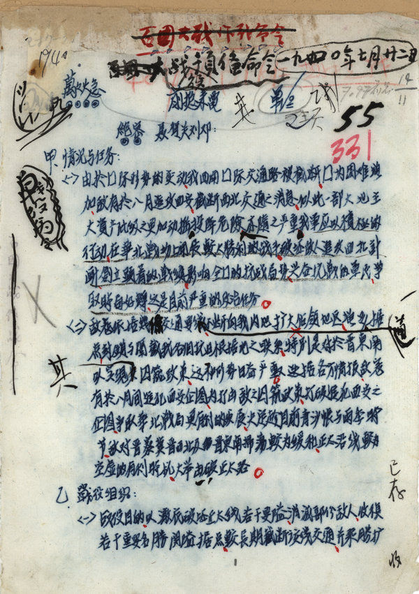 為粉碎侵華日軍的“囚籠政策”、遏制國民黨頑固派的妥協(xié)投降逆流,1940年8月至翌年1月,中國共產(chǎn)黨領(lǐng)導(dǎo)的八路軍在華北發(fā)動了百團(tuán)大戰(zhàn)。百團(tuán)大戰(zhàn)第一階段以破襲正太鐵路為重點(diǎn),這是1940年7月22日簽發(fā)的破襲正太路戰(zhàn)役預(yù)備命令(中央檔案館提供)。