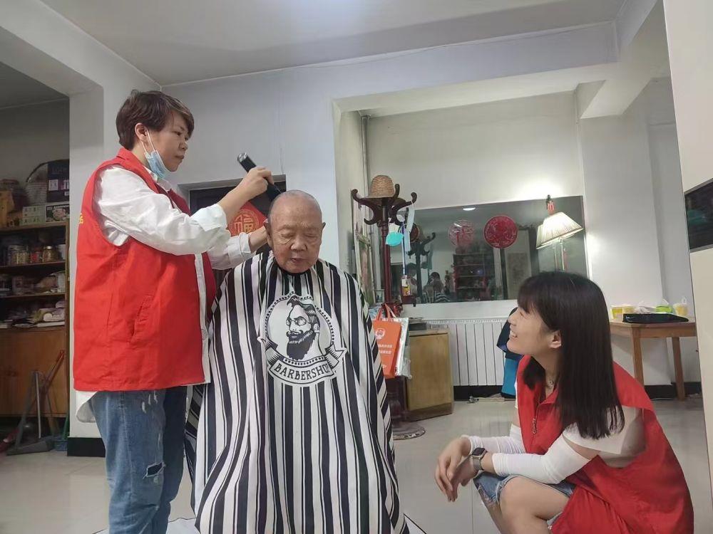 陜西西安碑林區黃雁社區的工作人員和志愿者上門為留守老人提供剪發服務。