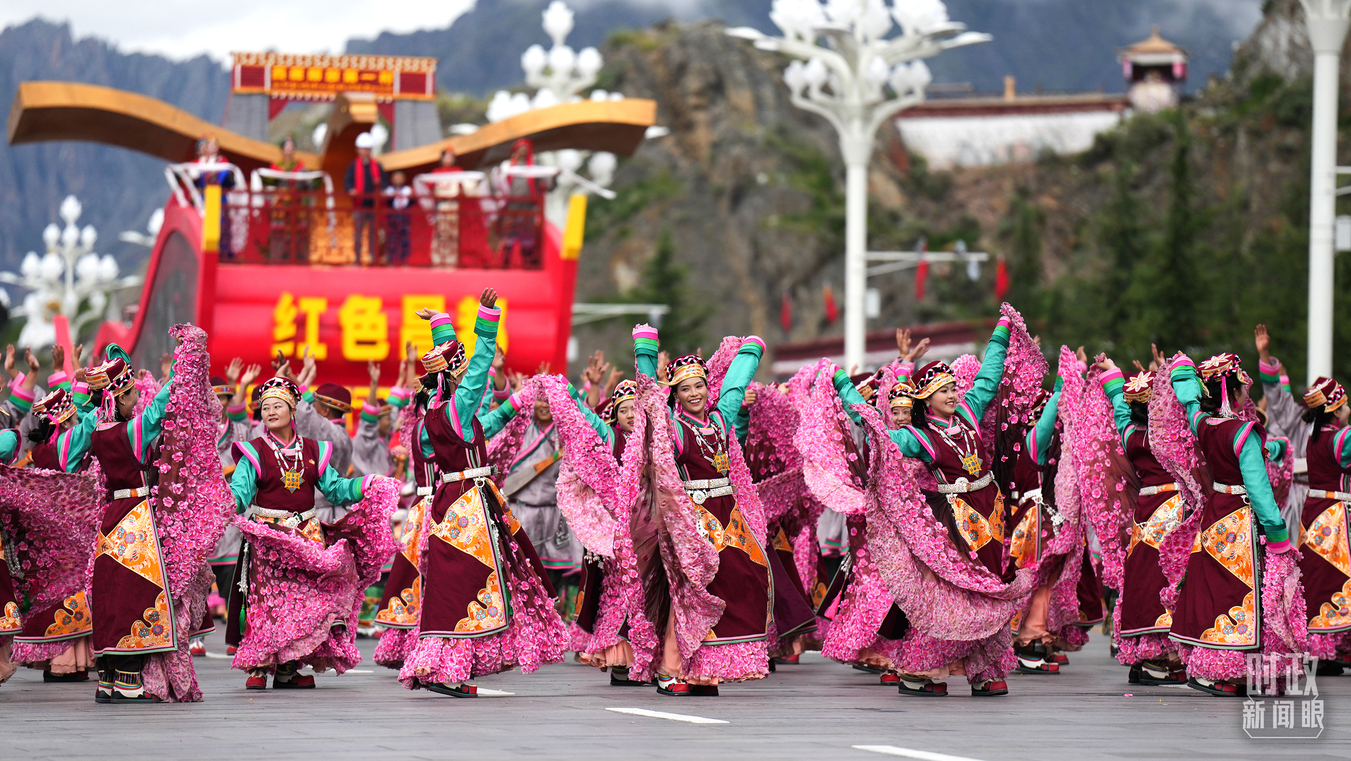 六十載櫛風(fēng)沐雨,一甲子滄海桑田。格桑花海群舞中,悠揚的扎念琴聲響起,雄渾的甲諧舞、瓊結(jié)卓舞、弦子舞、鍋莊舞、普蘭宣舞應(yīng)接不暇,舞出西藏繁榮發(fā)展的精氣神。身穿工布服飾、飛天服飾等藏族特有服飾的游行群眾,以一場非物質(zhì)文化遺產(chǎn)的盛宴向西藏自治區(qū)成立60周年獻禮。