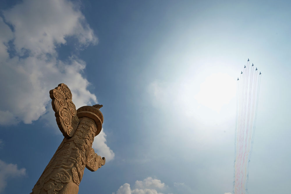 9月3日,紀念中國人民抗日戰爭暨世界反法西斯戰爭勝利80周年大會在北京隆重舉行。這是教練機梯隊接受檢閱。新華社記者 陳曄華 攝
