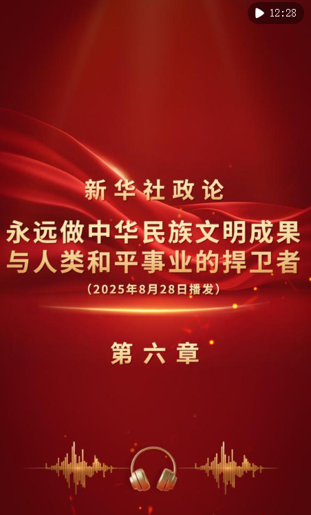 新華社8月28日播發《新華社政論|永遠做中華民族文明成果與人類和平事業的捍衛者——寫在中國人民抗日戰爭暨世界反法西斯戰爭勝利80周年之際》。我們邀請誦讀嘉賓劉勁演播“第六章”。