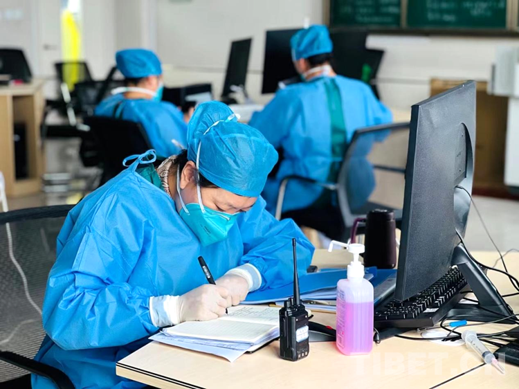 圖為拉薩市第二座方艙醫(yī)院護(hù)理隊(duì)隊(duì)長(zhǎng)央宗在記錄一天的重點(diǎn)工作 攝影:次仁卓瑪