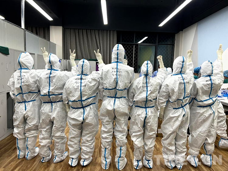 圖為拉薩市第二座方艙醫(yī)院醫(yī)護(hù)人員們正在穿防護(hù)服準(zhǔn)備開(kāi)始一天的工作 攝影:次仁卓瑪