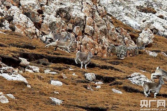 雪豹向巖羊群發起攻擊。央廣網發 馮剛 攝