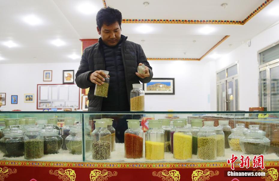 12月8日,青海省黃南藏族自治州尖扎縣,五谷畫藝人索南本查看農(nóng)作物儲存狀況。青稞、小麥、各式油菜籽等農(nóng)作物經(jīng)挑選、排列組合,“變身”精美的“尖扎五谷畫”。2007年,該縣藝人索南本開始創(chuàng)作藏式風(fēng)格五谷畫,摸索防臭、防蟲、防潮、裝裱等步驟,并在當(dāng)?shù)亻_展培訓(xùn),帶領(lǐng)殘疾、困難民眾進行創(chuàng)作,憑雙手致富。 中新社記者 馬銘言 攝