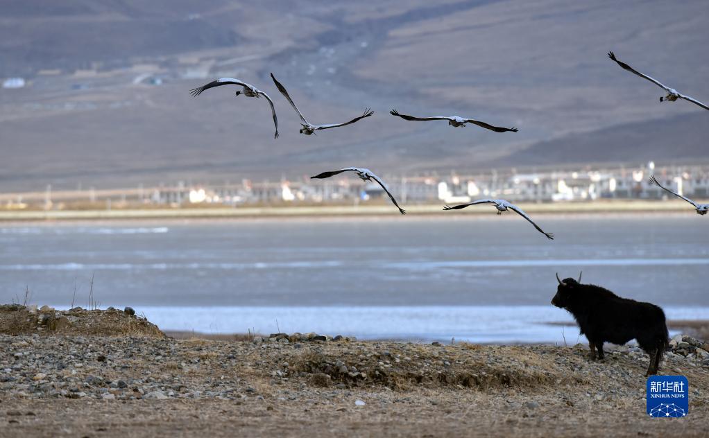 黑頸鶴在拉薩市林周縣黑頸鶴自然保護區飛翔(1月8日攝)。新華社記者 張汝鋒 攝