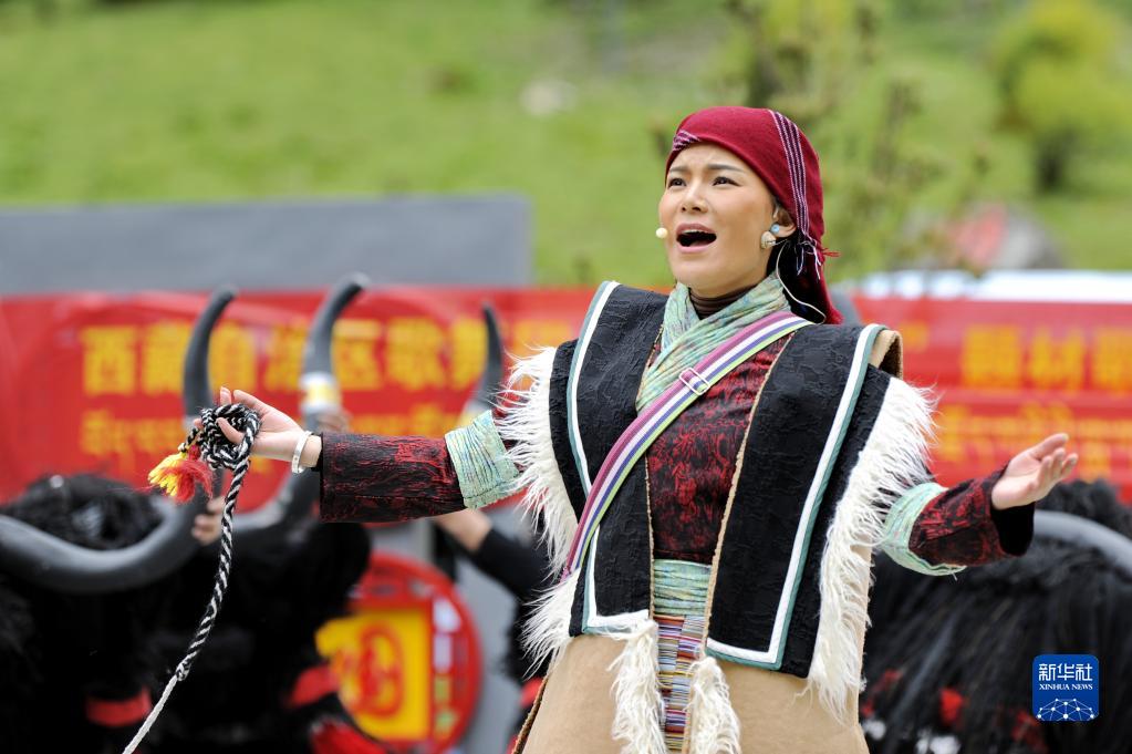 5月31日,演員在隆子縣玉麥鄉文化廣場表演歌舞劇《天邊格?;ā?。新華社記者 張汝鋒 攝