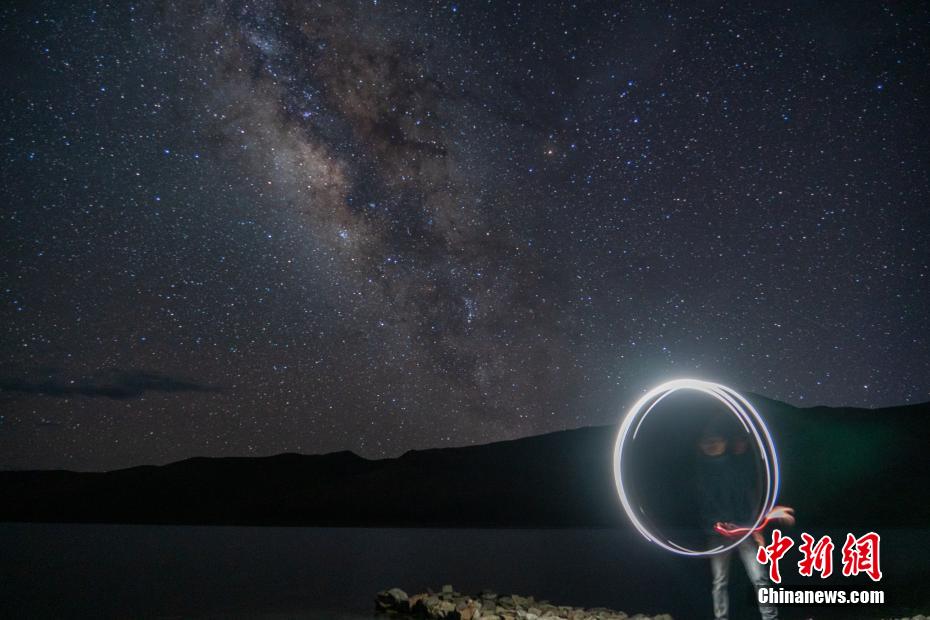 7月17日晚,游客在西藏羊卓雍錯(cuò)湖畔進(jìn)行光繪攝影,遠(yuǎn)處便是浩瀚銀河。江飛波 攝