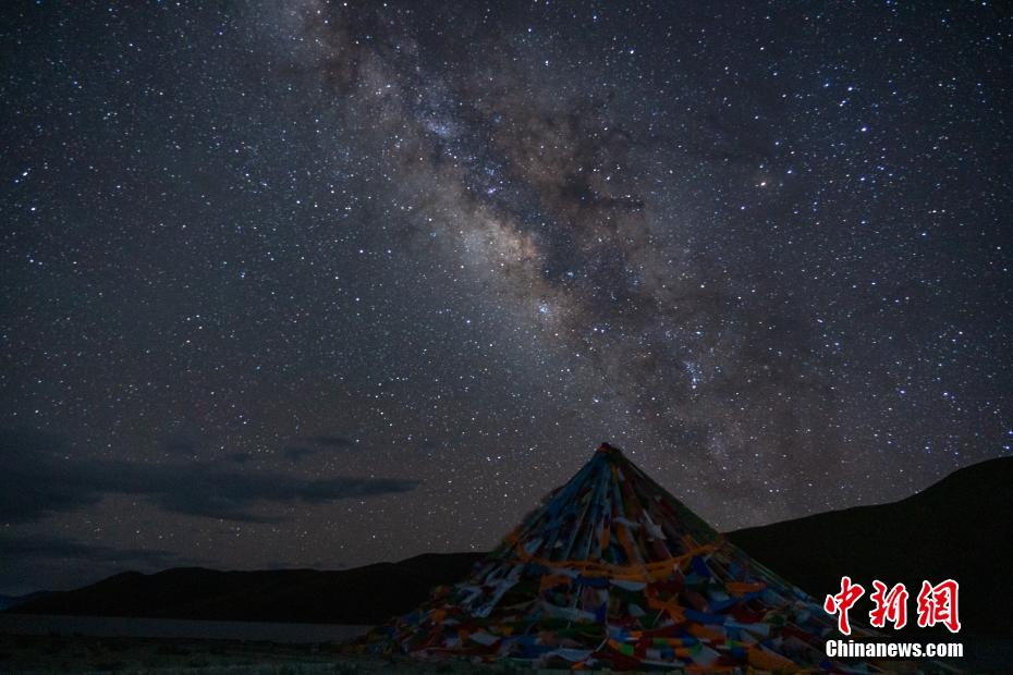 西藏羊卓雍錯(cuò)湖畔的經(jīng)幡與銀河。江飛波 攝