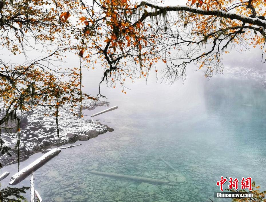 十月,九寨溝長海、原始森林等景點迎來入秋后的第一場雪。澄凈碧藍(lán)的海子和金色的彩林與潔白的雪花相映相襯,構(gòu)成一幅靜謐的美麗畫卷。遠(yuǎn)遠(yuǎn)看去,成片的彩林被一朵朵雪花點綴,美得像童話世界一般。 梁峰 攝