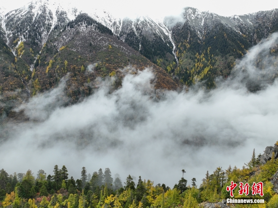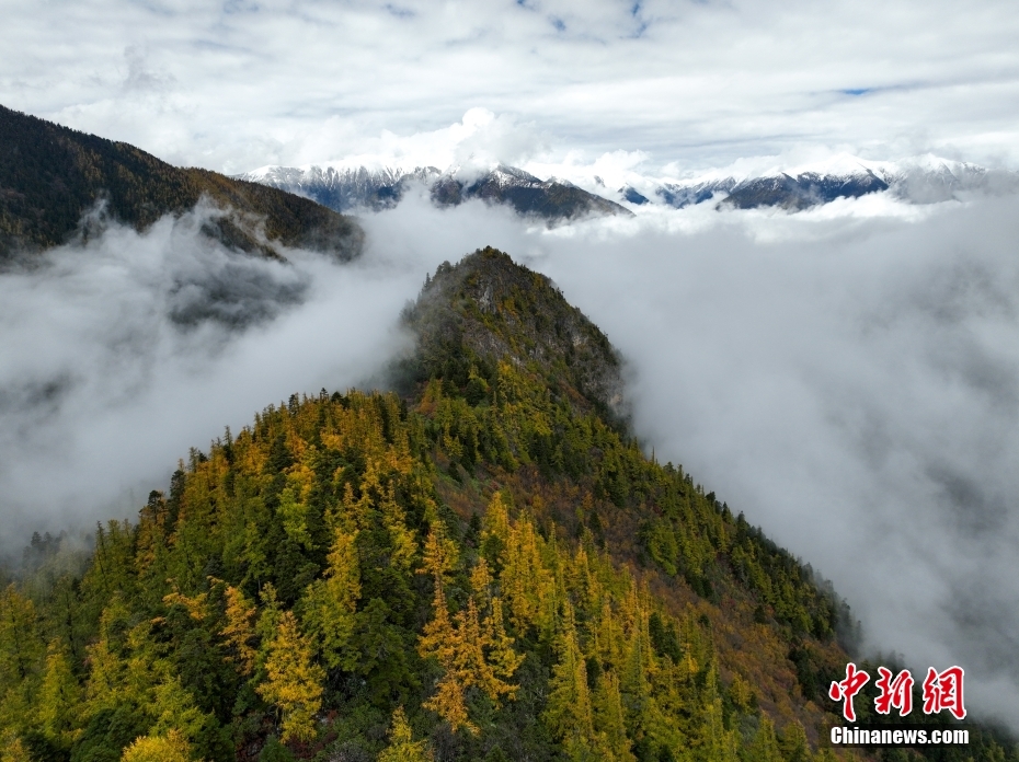 10月26日,航拍西藏多雄拉雪山,雪山與層林盡染的森林組成一幅壯美的秋日高原畫卷。西藏林芝多雄拉雪山位于喜馬拉雅山脈北段主脊,曾是徒步進入墨脫縣最艱險的路段之一。(無人機照片) 中新社發 董志雄 攝