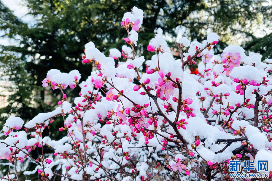 覆雪的花(3月30日攝)。新華網 柑丹鴦琦攝