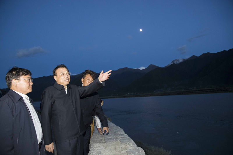 7月25日傍晚,李克強總理來到雅魯藏布江與尼洋河交匯處,考察水資源和生態保護情況。來源:中國政府網