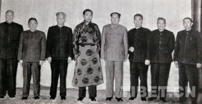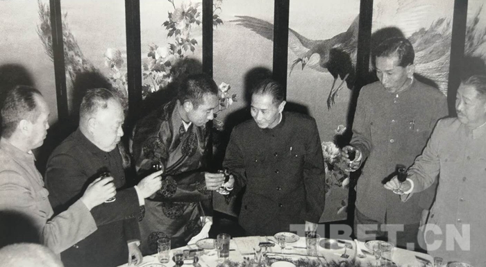 圖為1959年4月29日,中央駐藏代表張經武在北京飯店舉行宴會,慶祝西藏自治區籌備委員會成立三周年。右起:賀龍、阿沛?阿旺晉美、張經武、十世班禪、陳毅、烏蘭夫。