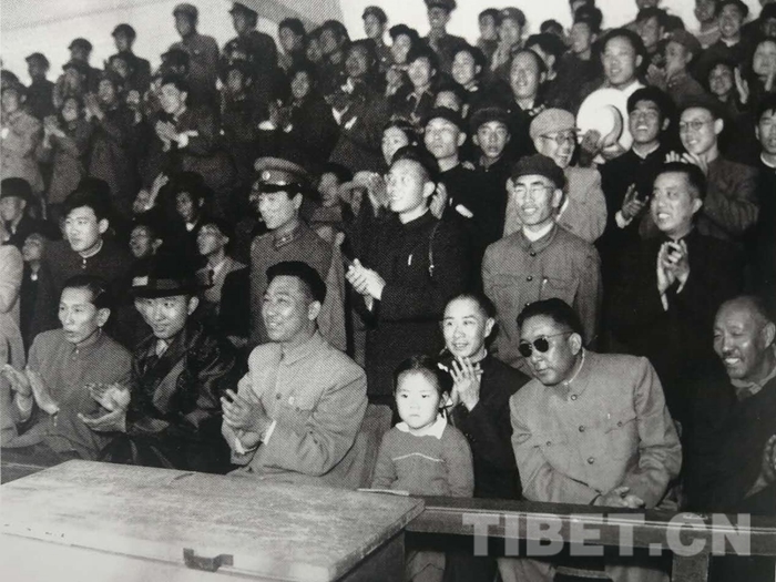 圖為1959年4月17日,張經武(一排左五)在北京陪同十世班禪(一排左二)、阿沛?阿旺晉美(一排左一)等觀看體育表演。