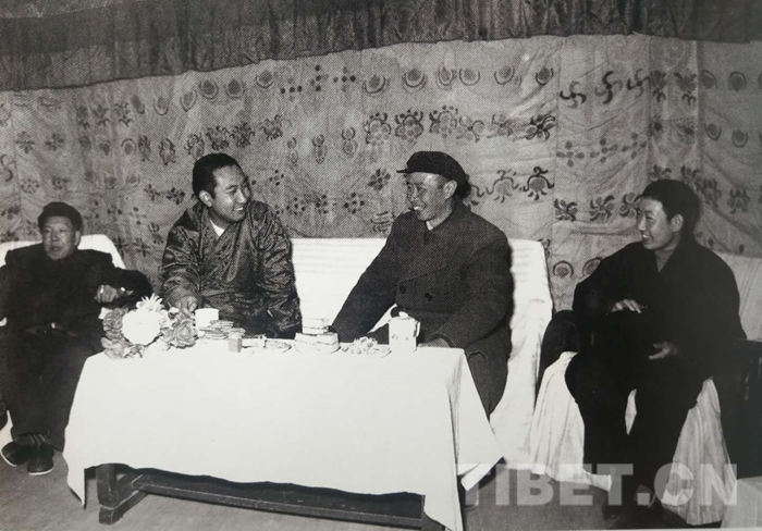 1960年2月16日,西藏自治區籌委會代理主任十世班禪(左二)、西藏自治區籌委會副主任帕巴拉?格列朗杰(右一)在北京參加建國十周年慶祝活動并在內地參觀后回到拉薩。圖為張經武(右二)與十世班禪等親切交談。