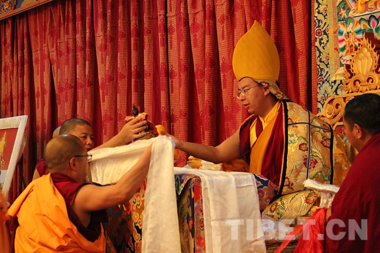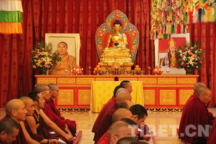 圖為土多申格副院長帶領經師代表和學員代表,虔誠地向十一世班禪敬獻曼扎、佛像、佛塔、佛經。攝影:孫健