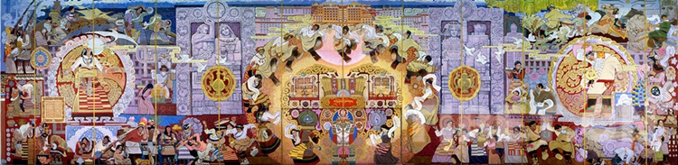 走進人民大會堂西藏廳,一幅大型丙烯壁畫《扎西德勒圖——歡樂的藏歷年》(長18米,高4.5米,下文簡稱《扎西德勒圖》)映入眼簾,蔚為壯觀。