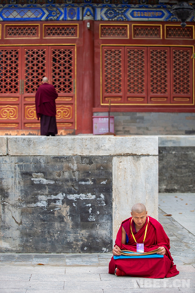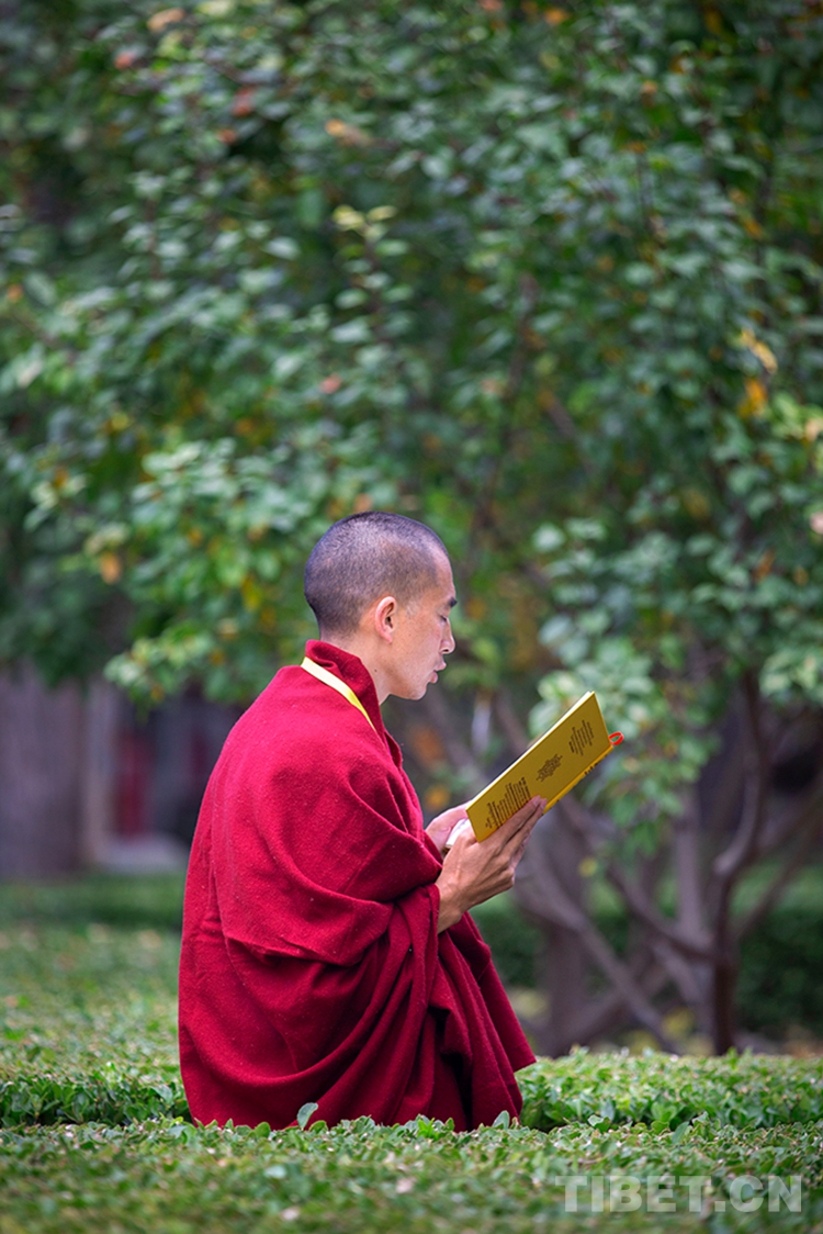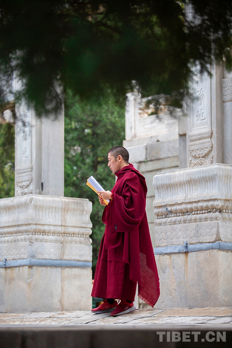 中國西藏網訊 10月29日,深秋的清晨,位于北京西黃寺的中國藏語系高級佛學院內,古柏蒼蒼,清凈肅穆。還有半個小時,2020年藏傳佛教第十六屆“拓然巴”高級學銜畢業考試辯經考試就將準時開始。等待參加辯經考試的學僧們,正在西黃寺大殿前誦經,抓緊時間為考試進行最后的準備。大家或席地而坐,或立定一隅,或踱步前行,梵唱聲聲,余音繞梁。(中國西藏網 攝影/許娜 編輯/周晶)