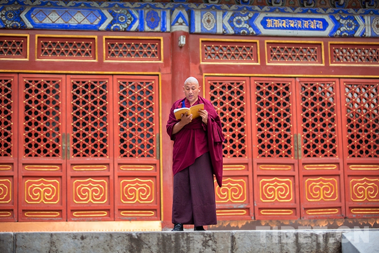 圖為即將參加2020年藏傳佛教第十六屆“拓然巴”高級學銜畢業考試辯經考試的學僧專注誦經 攝影:許娜