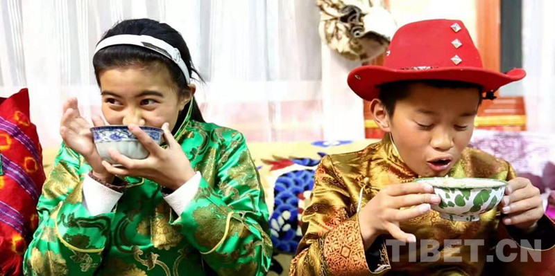 圖為索南旺久一家換上節日的盛裝一起吃“古突” 攝影:吳學明