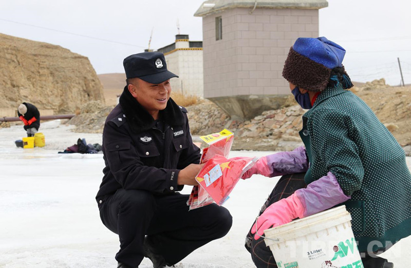 在群眾家里、街道上、冰河上,直克鄉(xiāng)邊境派出所民警向群眾送出了一面面嶄新的國(guó)旗,鮮紅的國(guó)旗映紅了每個(gè)人的臉龐,將揚(yáng)帆啟航新征程的祈愿深入每個(gè)人的心中。直克鄉(xiāng)索白村退伍老兵朗加激動(dòng)地說(shuō):“國(guó)旗是祖國(guó)的象征和標(biāo)志,需要共同守護(hù)。在雪域高原上,你們戰(zhàn)嚴(yán)寒、耐寂寞,披星戴月、頂風(fēng)踏雪,燃起了警民‘共話護(hù)邊’的愛國(guó)熱情,謝謝你們用實(shí)際行動(dòng)溫暖著我們?!?/p>