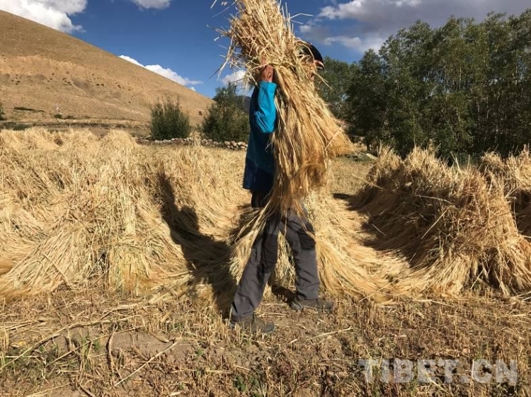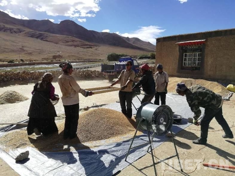 工作隊根據在前期深入群眾家中和田間地頭了解到的“孤困寡”等人群在秋收中存在勞動力緊缺等問題,號召全體駐村隊員和村黨員干部組成青稞秋收黨員志愿服務隊自2017年9月13日起,對村孤寡戶、缺乏勞動力戶及特困戶進行秋收幫扶,僅用3天就完成困難戶的收割,解決了他們勞力緊缺的燃眉之急。9月底,拉木堆村的秋收工作已經進入收尾階段。村民們都說,今年因為有收割機,收割時間比去年縮短了兩天。當全村408畝青稞全部收割完畢,堆置田地中晾曬。聽說今年糧食產量預計將比上年增收10%左右,再創(chuàng)新高,從干部到群眾,人人樂開了花。