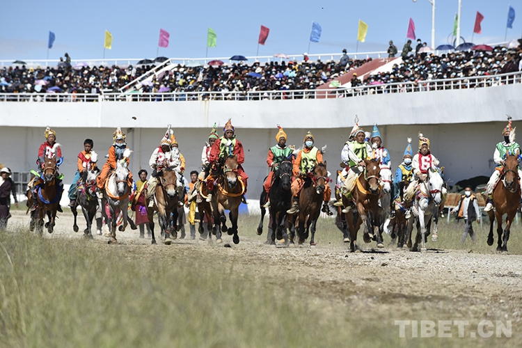 圖為那曲市2020羌塘恰青格薩爾賽馬藝術節場內速度賽馬比賽現場,少年們策馬而行(資料圖)