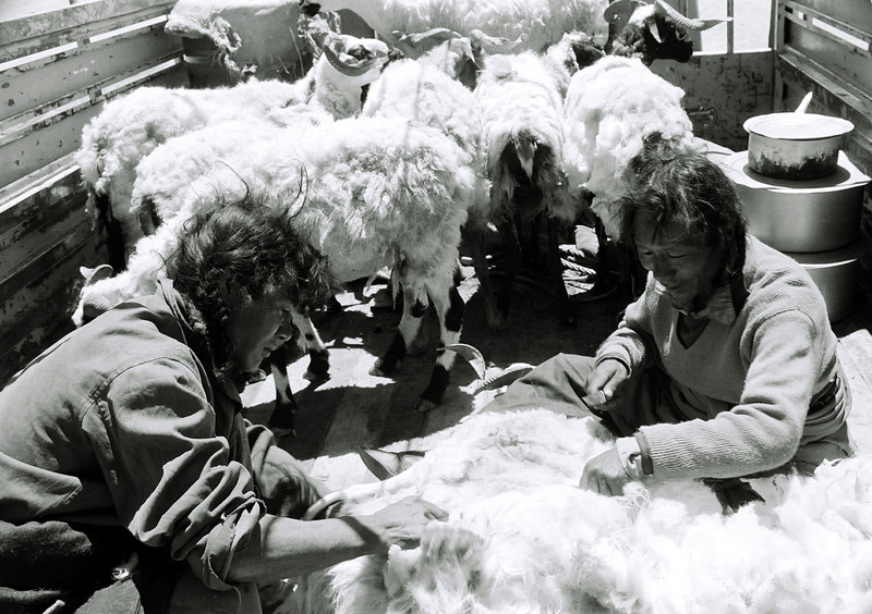 40歲上下的索仁正在那里“剪”羊毛,準確地應該說是在那里割羊毛。他手中握著一把帶柄的刀,兩個膝蓋壓住躺在地上的綿羊,10多歲的兒子抓著羊角,刀看起來很鋒利,只見一團團羊毛不斷地從羊身上滑落下來,十幾分鐘一只羊就被他“剪”完了毛,據說“割毛”并不比剪毛慢。藏北西部乃至西藏至今還有不少牧民沿用這種古老的“剪”毛方法。他的妻子和兩個女兒則把割下的羊毛擰成繩打成捆。