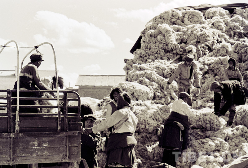 這是藏北雙湖辦事處(現雙湖縣)和平鄉牧民正在裝車外運交售的畜產品(唐召明1987年攝)
