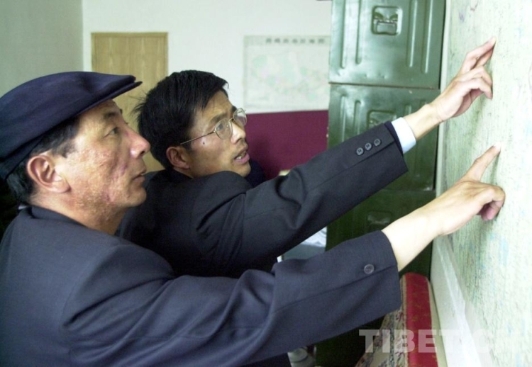 這是時任雙湖特別區(現雙湖縣)區委書記的范科創(右)與副區長珠巨(左)在研究當地的經濟發展規劃。為了無人區開發事業,范科創在這里默默奉獻了15個春秋。1986年,他被西藏自治區黨委授予“優秀黨務工作者”榮譽稱號(唐召明2001年攝)