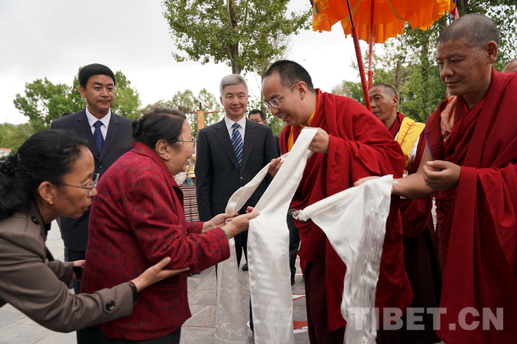 圖為西藏自治區黨委常委、統戰部部長,區政協黨組副書記、副主席旦科與班禪互敬哈達、互致問候 攝影:王淑