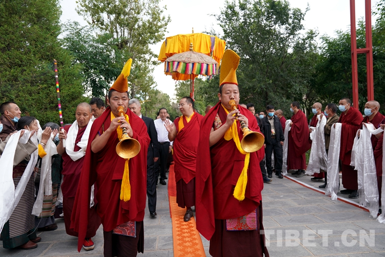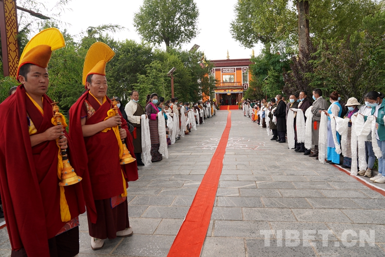 隨后,班禪乘車抵達位于拉薩的班禪行宮雪林多吉頗章。細雨綿綿的拉薩城,清風習習涼爽宜人。西藏自治區黨委常務副書記、自治區政協黨組書記莊嚴與十九屆中央候補委員,西藏自治區黨委副書記、拉薩市委書記嚴金海等西藏自治區相關領導在此迎候。拉薩各大寺廟的僧眾代表和信教群眾代表手捧潔白的哈達在微微細雨中翹首以盼班禪的到來。