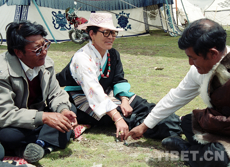1987年盛夏,時任那曲地區(現那曲市)行署副專員的次仁玉珍(中)在那曲賽馬會的帳篷前,席地而坐與那曲地區行署專員土登才旺(左)、那曲地區文化局局長阿布(右)在交流(唐召明1987年攝)