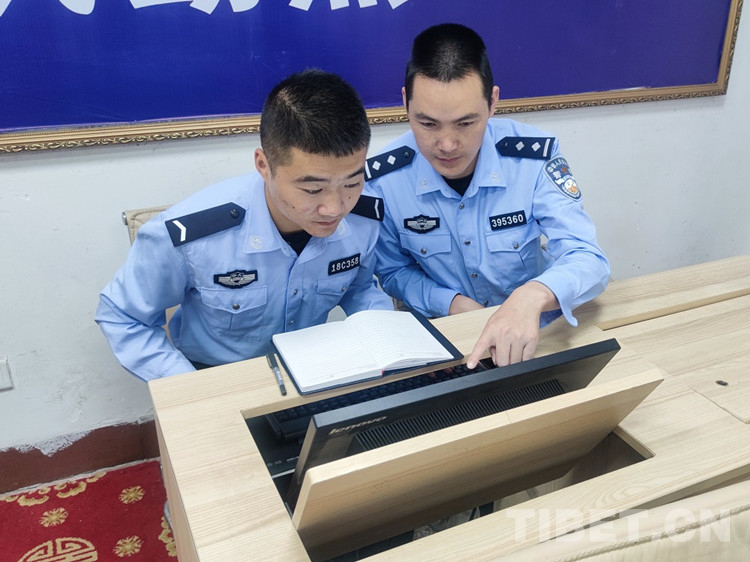 圖為劉華強(右)正在指導(dǎo)新警李東洪進(jìn)行邊檢業(yè)務(wù)學(xué)習(xí) 攝影:尼瑪云丹