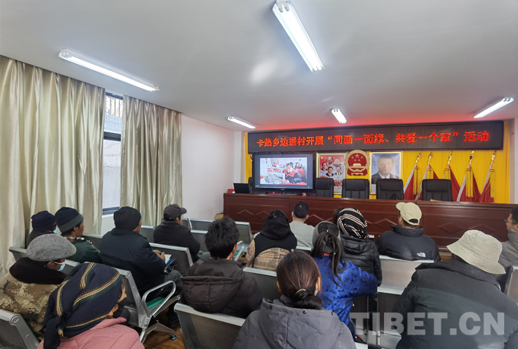 圖為卡熱鄉6個村(居)第一書記和邊據村黨員、群眾代表正在觀看講述西藏各族人民愛護國旗的視頻