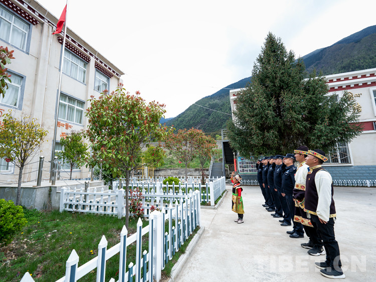 來自派鎮(zhèn)雪卡村的5歲小女孩旦增玉珍在林芝邊境管理支隊(duì)派邊境派出所,與移民管理警察共同參加升旗儀式。還在上幼兒園的她,像學(xué)校里的哥哥姐姐們一樣,一邊敬禮一邊唱國(guó)歌,同派出所民警一起接受愛國(guó)主義熏陶。
