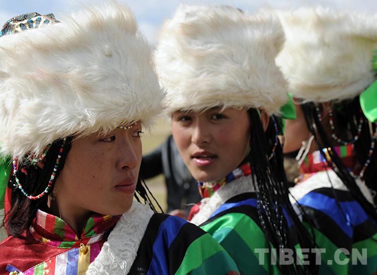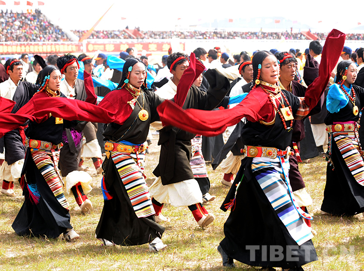 這是在藏北首府那曲鎮舉辦的草原賽馬盛會上,如今沒有了“高原紅”的藏族婦女在跳大型“鍋莊舞”(唐召明2013年8月10日攝)
