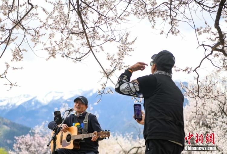 游客在嘎拉村桃樹下唱歌 中新社 貢嘎來松/攝