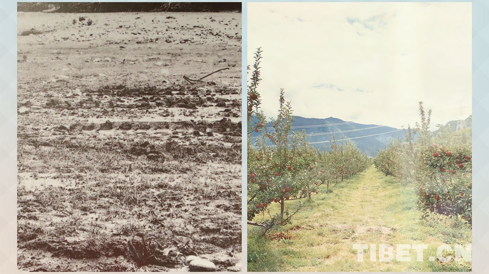 左圖,過去嘎拉村采摘園改造前的荒地;右圖,現在嘎拉村實施觀光采摘園項目。 孔夏翻拍自嘎拉村紅色研學主題教育展覽館