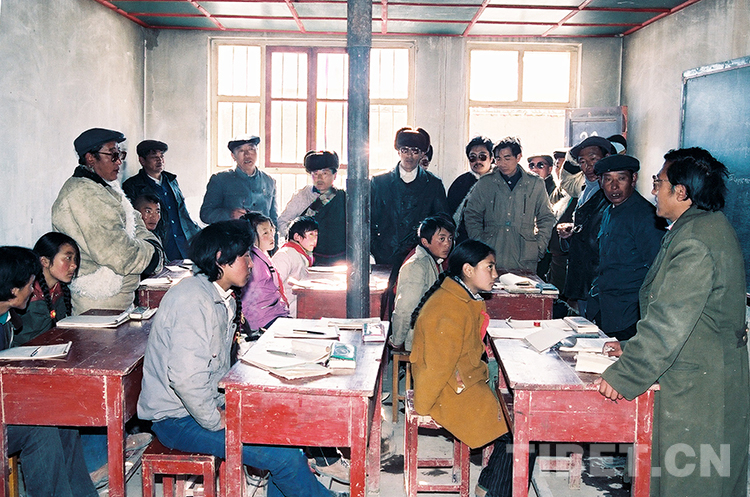 這是那曲地區“訪問團”人員在參觀文部辦事處小學(唐召明1989年12月份攝)