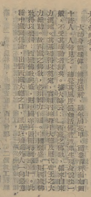 次年,應重慶漢藏教理院和成都佛學社的邀請,東本格西決定前往當地講法。期間,日本空襲不斷,拉薩官民與弟子因憂慮東本格西安危,力勸其勿前往。但是,東本格西從佛教利益世間的角度出發,認為在當地民眾苦難之際,作為僧人更應不懼危險,前往當地慰藉民眾,以紓解戰爭造成的創傷與苦痛。1943年1月,東本格西從拉薩啟程前往理化(今理塘),參加九世班禪靈童尋訪測驗事宜。4月,經由康定抵達成都,沿途受到各地政府官員與僧俗弟子的歡迎。東本格西應中國邊疆問題研究會邀請講演“佛教與邊疆”,蒙藏委員會委員格桑澤仁翻譯。[3]講演內容主要分為三部分:首先,詳細敘述藏傳佛教發展演變的歷史,提出因于歷代高僧與中央政府的大力維護與資助,藏傳佛教發展的基礎才得以奠定;其次,分析邊疆佛教的分布與信仰狀況;最后,分析佛教與邊疆的關系。[4]他在講到佛教昌盛與國家實力發展之間的關系時,明確提出“西藏之佛教,必須國力保護,中國強盛,則藏傳佛教得以發揚,藏傳佛教興盛,則中國亦可因而得到幸福”[5]。東本格西從歷史和現實角度詮釋西藏作為中華民族共同家園的角色,邊疆不惟具體的地理概念和信仰文化差異的標簽,而是中央政府長期支持發展的歷史凝結,是中華民族共同家園的一分子。