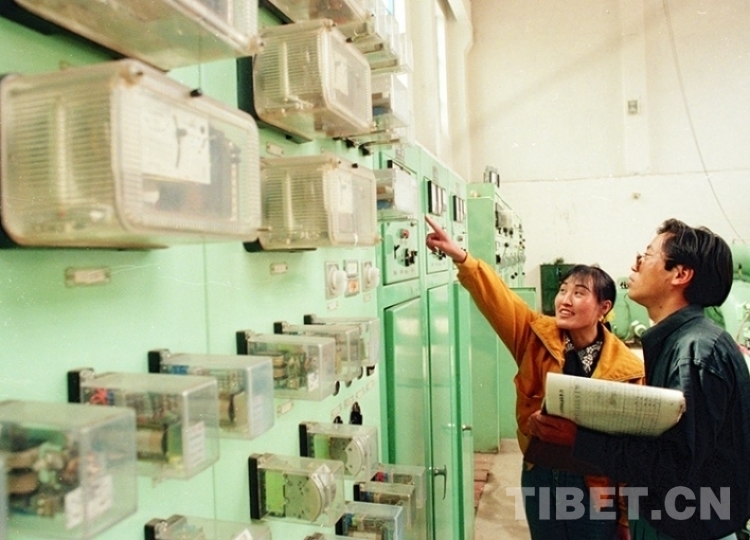 這是巴青縣水電站機房人員在工作。該水電站由吉林省所援建(唐召明1997年攝)
