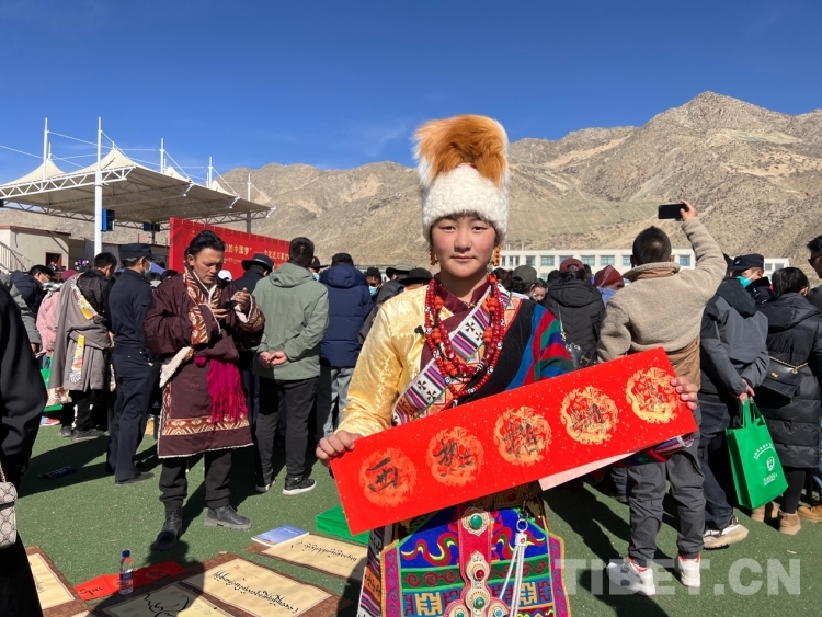 圖為群眾拿到寫(xiě)有“扎西德勒”字樣的書(shū)法作品 攝影:德吉卓瑪