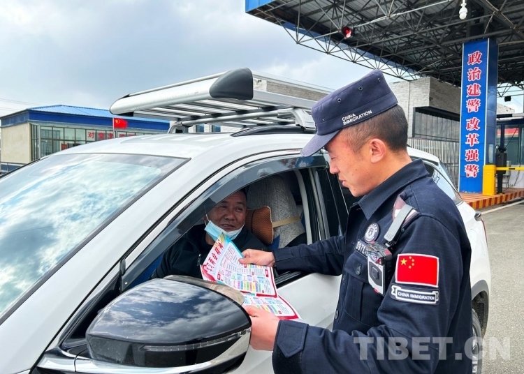 圖為錯那邊境檢查站執勤民警為過往旅客發放宣傳單