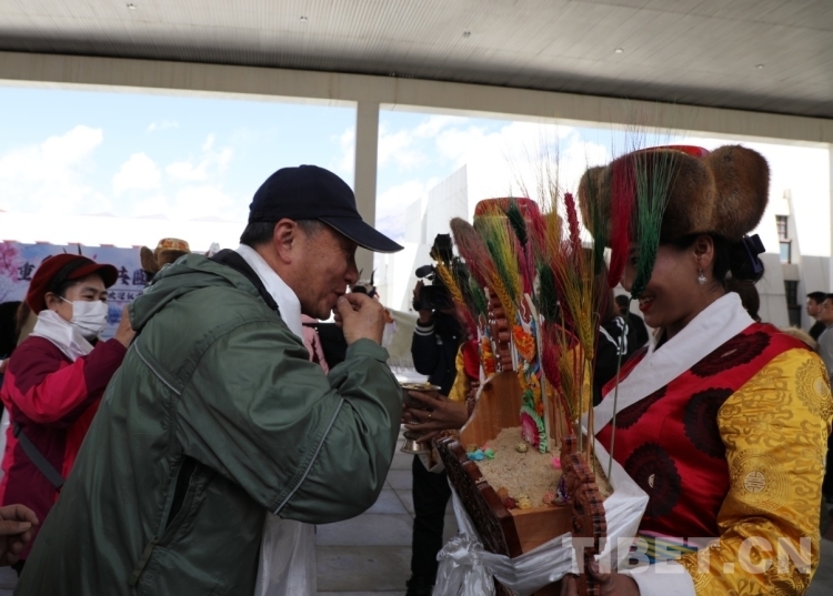 圖為歡迎儀式上,歡迎人員敬獻“切瑪”,歡迎“老西藏”。葉鵬(左)熟練地以藏族禮節回應 攝影:王茜