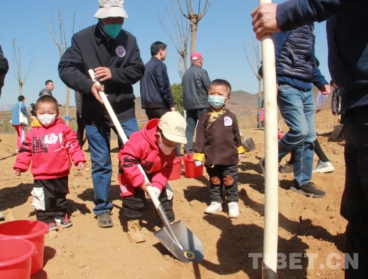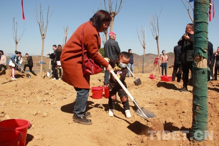來自青海省果洛藏族自治州的多杰雖然才3歲多,但在掌握了鐵锨的使用后,他就成了整個植樹區域的熱心人,到處幫助別人鏟土,樂此不疲。圖為多杰正在幫助別人鏟土植樹 攝影:劉莉